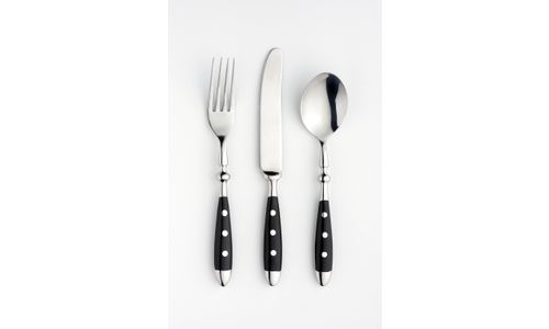 Een steakmes met landelijk design dat dankzij de zwarte, stevige handvaten goed in de hand ligt.