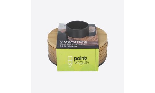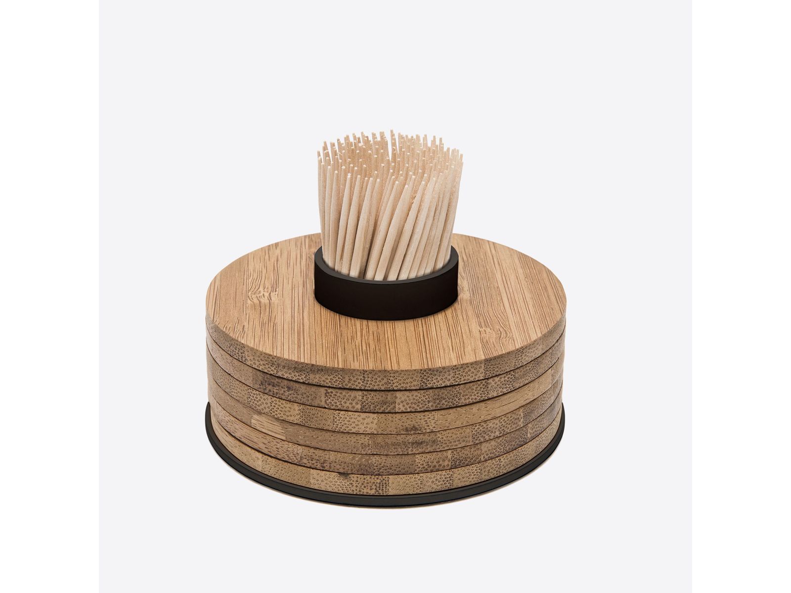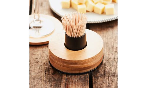 Voorzie je eettafel steeds van tandenstokers en onderzetters met deze functionele bamboe glasonderzetters op een zwarte tandenstokerhouder van Point-Virgule.
