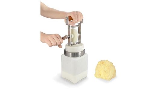Ontdek het genot en de authentieke smaak van zelfgemaakte boter. Gemakkelijk! Giet de volle room in de pot en draai aan het handvat tot de boter wordt gevormd. Volgens smaak kan er zout, kruiden en specerijen aan worden toegevoegd. Met een capaciteit van 1,6L en uitgerust met een pallet van RVS dorsen.