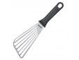 Deze hoogwaardige draaier is gemaakt van roestvrij staal en heeft een recht, flexibel en gesleufd mes voor intensief gebruik in de professionele keuken. Het is ideaal voor het optillen en draaien van geroosterd en gegrild voedsel op grillplaten, pannen, plancha's of BBQ. De sleuven zorgen ervoor dat overtollig vet eraf kan druipen en broodkruimels worden niet beschadigd door het kleinere contactoppervlak met het vlees. Door zijn extreme stabiliteit is hij ideaal voor gebruik in de commerciële sector of voor de grillprofessional thuis.