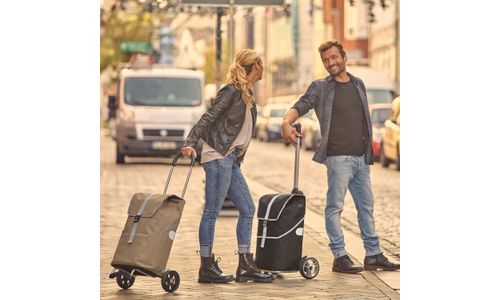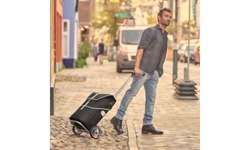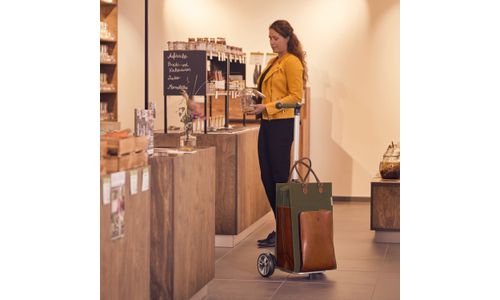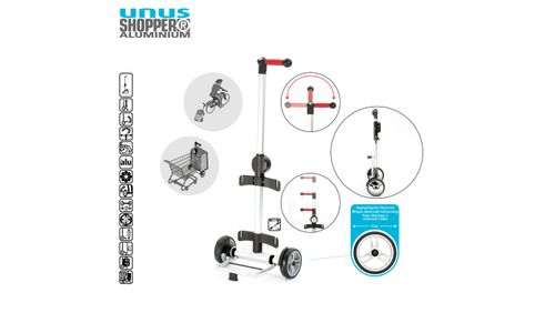 De Unus Shopper® is gemaakt van lichtgewicht aluminium. De innovatieve 3-wegsysteemhandgreep kan met één druk op de knop in drie verschillende posities worden versteld en ondersteunt zo een natuurlijke handhouding. De telescoopsteel is traploos verstelbaar en kan optimaal worden aangepast aan de lichaamsgrootte. Het chassis kan eenvoudig aan een fiets worden gekoppeld met behulp van het Andersen koppelsysteem Bike & Easy . Met een totaal draagvermogen van 40 kg zijn zelfs zware lasten geen probleem voor de Unus Shopper®.