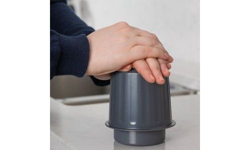 Plaats de gebruikte aluminium capsule met de foliezijde naar beneden over het gat in het deksel. Plaats de stamper over de emmer en oefen met beide handen neerwaartse druk uit.