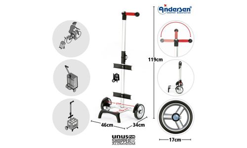 Unus Shopper® Fun Het Unus Shopper® Fun frame is gemaakt van lichtgewicht aluminium. De innovatieve 3-wegsysteemhandgreep kan met één druk op de knop in drie verschillende posities worden versteld en ondersteunt zo een natuurlijke handhouding. De stang kan in verschillende posities worden vergrendeld en zorgt zo voor een optimale gewichtsverdeling. De Unus Shopper® Fun is eenvoudig aan een fiets te koppelen door middel van het Andersen koppelsysteem. Met een totaal draagvermogen van 40 kg zijn zwaardere lasten geen probleem voor de Unus Shopper® Fun.