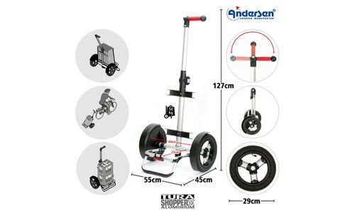 Het Tura Shopper®-chassis is de perfecte metgezel voor grote aankopen en lange reizen en is speciaal ontworpen voor onze grote tassen. Met een totaal draagvermogen van 50 kg zijn zelfs zware lasten geen probleem voor de Tura. De innovatieve 3-wegsysteemhandgreep kan met één druk op de knop in drie verschillende posities worden versteld en ondersteunt zo een natuurlijke handhouding. De telescoopsteel is traploos verstelbaar en kan optimaal worden aangepast aan de lichaamsgrootte. De Tura Shopper® kan eenvoudig aan een fiets worden gekoppeld met behulp van het speciaal ontwikkelde Bike & Easy koppelsysteem.