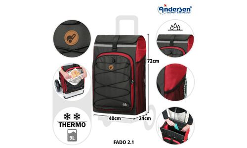 Samen met de Fado 2.1 tas wordt de Shopper® een allrounder. De grootste Shopper®-tas uit de Andersen-collectie biedt voldoende ruimte voor bulkinkopen, een dagje uit met het hele gezin of als ideale metgezel voor kinderdaggroepen. Een thermotas houdt koel eten en drinken lang vers. De Fado 2.1 tas is waterafstotend en bestand tegen lichte vervuiling. Een geïntegreerde regencape beschermt de Fado 2.1 tas zelfs bij hevige regen. Reflectoren aan de voorkant en zijkanten zorgen voor een goede zichtbaarheid in het verkeer, ook in het donker of bij slecht weer.