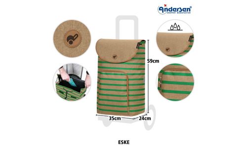 Samen met de Eske tas wordt de Shopper® een kleurrijke eyecatcher. Kleurrijke strepen op een beige achtergrond geven de Eske tas een vrolijke uitstraling. Met een inhoud van 47 liter is de tas groot genoeg om boodschappen te doen in de supermarkt of op stap te gaan met vrienden. Een voorvak en een binnenzak bieden ruimte voor kleine spullen. Reflectoren aan de zijkanten zorgen voor een goede zichtbaarheid, zelfs in het donker. De materiaalsamenstelling maakt de tas bovendien waterafstotend en bestand tegen lichte vervuiling.
