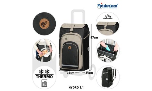 De bijpassende Hydro 2.1 Shopper® tas laat niets te wensen over. De Hydro 2.1 biedt veel opbergruimte met zijn grote tas, een binnenzak en twee zijvakken. Een extra thermovak houdt dranken lang koel en diepvriesproducten vers. Dankzij de materiaalsamenstelling is de tas waterafstotend en vuilafstotend. Het bijzondere aan de Hydro 2.1 is de rugzakfunctie, die van een winkelwagen een grote rugzak maakt voor boodschappen, familie en vrije tijd.