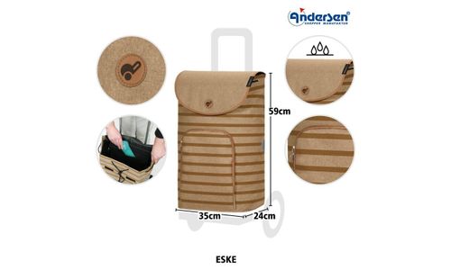 Samen met de Eske tas wordt de Shopper® een kleurrijke eyecatcher. Kleurrijke strepen op een beige achtergrond geven de Eske tas een vrolijke uitstraling. Met een inhoud van 47 liter is de tas groot genoeg om boodschappen te doen in de supermarkt of op stap te gaan met vrienden. Een voorvak en een binnenzak bieden ruimte voor kleine spullen. Reflectoren aan de zijkanten zorgen voor een goede zichtbaarheid, zelfs in het donker. De materiaalsamenstelling maakt de tas bovendien waterafstotend en bestand tegen lichte vervuiling.