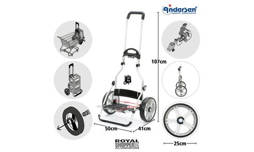 De Royal Shopper® met kogelgelagerde fluisterwielen is bijzonder stil en dankzij de vervaardiging uit hoogwaardig aluminium ook zeer licht met een eigen gewicht van 2,5 kg. Met behulp van het speciaal ontwikkelde Bike & Easy koppelsysteem kan de Royal Shopper® als fietskar aan vrijwel iedere standaard fiets worden bevestigd. Met een totaal draagvermogen van 50 kg zijn zelfs zware lasten geen probleem voor de Royal Shopper®.