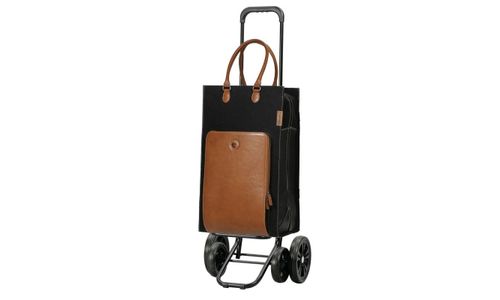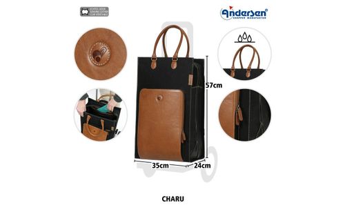 Samen met de Charu tas voor de Shopper® wordt de winkelwagen een blikvanger. Met zijn trendy retro-design is de tas van natuurlijke materialen en gecertificeerd echt leer de perfecte metgezel om te winkelen op de wekelijkse markt of in de supermarkt. De Charu tas is met 49 liter groot genoeg en biedt daarnaast ruimte voor een portemonnee, mobiele telefoon en sleutels in de binnenzak. De Charu tas is dankzij de donkere basis waterafstotend en bestand tegen licht vuil.