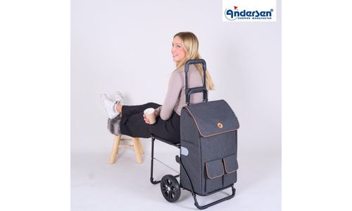 Tijdens lange reizen of korte winkeltrips biedt de Komfort Shopper® met zijn geïntegreerde uitklapbare stoel altijd de mogelijkheid om even te pauzeren. De winkelwagen met zitje heeft een draagvermogen van 50 kg en kan ook zware aankopen zoals kratten drank zonder problemen veilig vervoeren. Met behulp van het speciaal ontwikkelde Andersen Bike&Easy koppelsysteem kan de Komfort Shopper® in slechts enkele stappen als boodschappentrolley op de fiets worden gebruikt. De fluisterwielen zijn zeer stil en lopen soepel, zelfs op oneffen ondergrond.