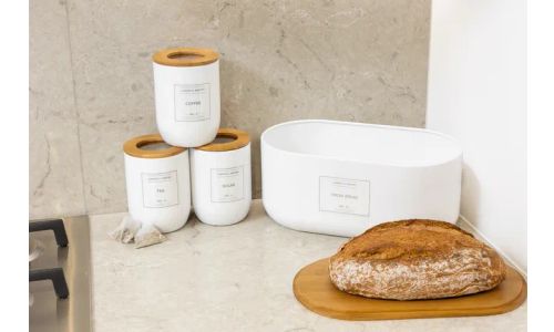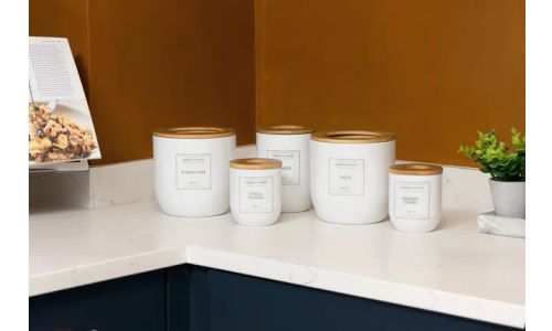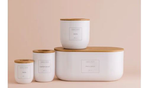 - Eigentijdse apothekersstijl met neutrale tinten en contrasterend bamboe in donkere tinten.