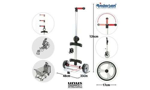 De Unus Shopper® is gemaakt van lichtgewicht aluminium. De innovatieve 3-weg systeemhandgreep kan met één druk op de knop in drie verschillende standen worden gezet en ondersteunt zo een natuurlijke handhouding. De telescopische handgreep is traploos verstelbaar en kan optimaal aan de lichaamsgrootte worden aangepast. Het chassis kan eenvoudig aan een fiets worden gekoppeld met behulp van het Andersen-koppelsysteem Bike & Easy . Met een totaal draagvermogen van 40 kg zijn zelfs zware lasten geen probleem voor de Unus Shopper®.