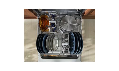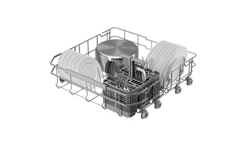 De vernieuwde, soepel glijdende FlexiMax-korven hebben twee neerklapbare rijen voor groot of onhandig servies. Antislip rubberen houders en spikes beschermen glaswerk en delicate items tegen botsen. De bestekmand kan gesplitst worden om in de beschikbare ruimte te passen.